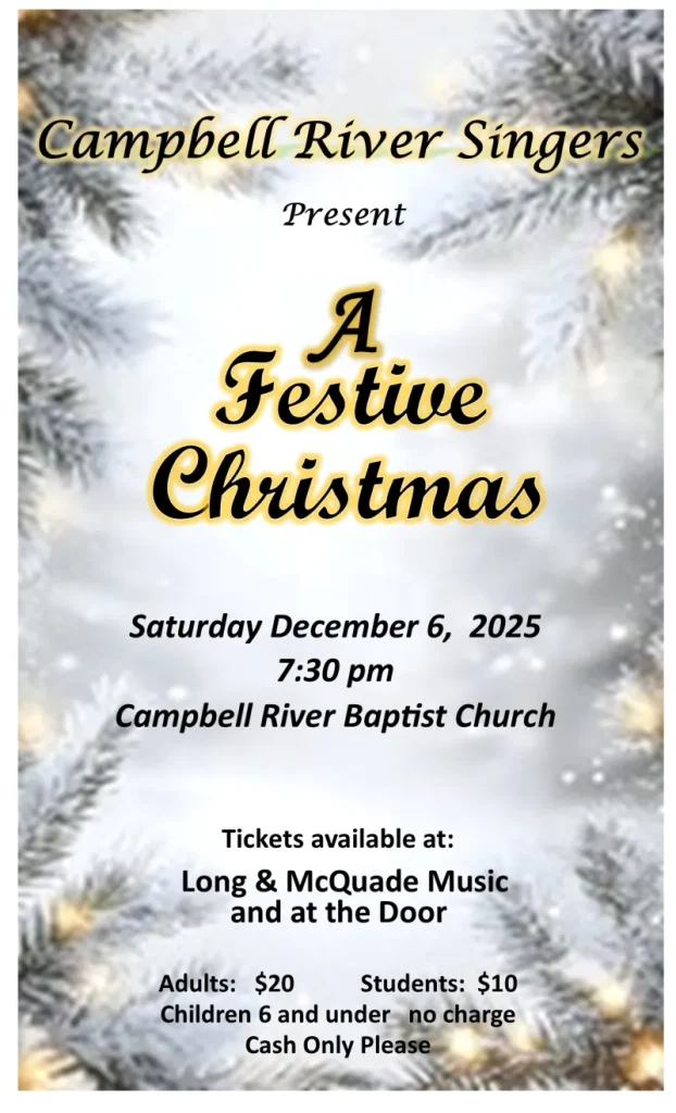 Mark your calendar for Saturday, December 6, 2025. The music starts at 7:30 pm at the Campbell River Baptist Church on Dogwood Street.